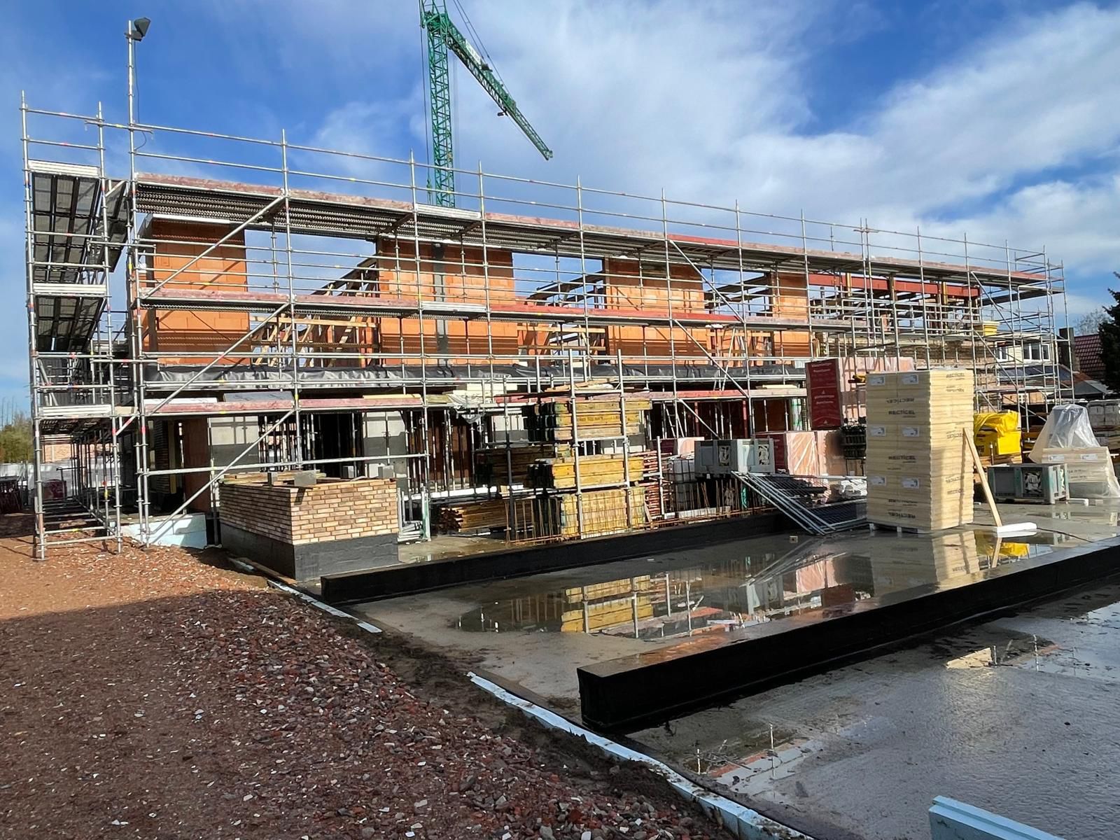 Er wordt nog steeds naarstig gewerkt op onze werf in Oelegem. De dakwerken zijn intussen volop aan de gang en geven het gebouw meer en meer een duidelijke vorm.